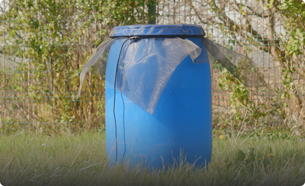 Filet élastique qui couvre l’ouverture des cuves/tonneaux pour empêcher la ponte des moustiques et l’entrée de débris/animaux, tout en laissant passer l’eau de pluie.